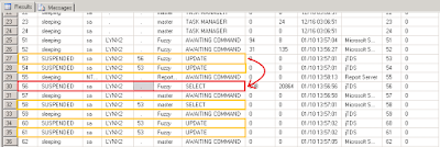 You can see all of the spids for sessions to the database. There should be five that we're are interested in: one for the "work queue" query and four for the workers to perform updates. The sp_who2 output includes a blkBy column which shows the spid that is blocking the given spid in the case that the given spid is SUSPENDED.
